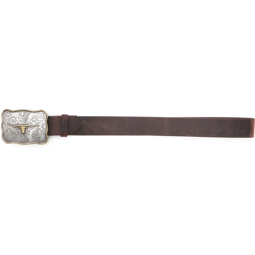 From And West, this belt and buckle set features a three-dimensional longhorn rope edge plaque buckle and snaps that allow you to change out the buckle with a distressed brown strap.