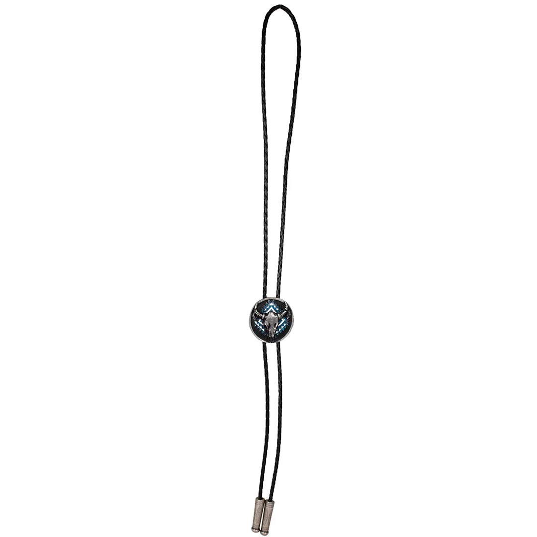When it’s time to dress up, you can’t go wrong with a classic western look. This dressy bolo tie is made of braided leather with metal tips and has a circular slide with a steer skull on a turquoise and white Aztec background.