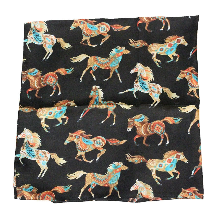 This wild rag scarf is perfect for horse lovers! It is black with a tribal horse design and being made of 100% silk, it’s great in warm and cold weather.