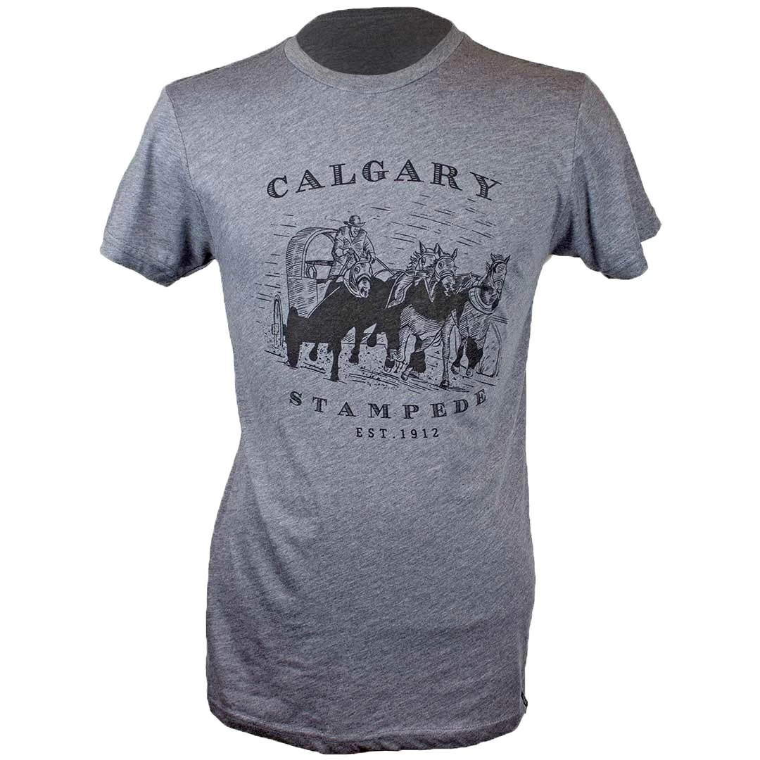 Custom made for the Calgary Stampede, this t-shirt features short sleeves, crew neck and a Calgary Stampede chuckwagon graphic.