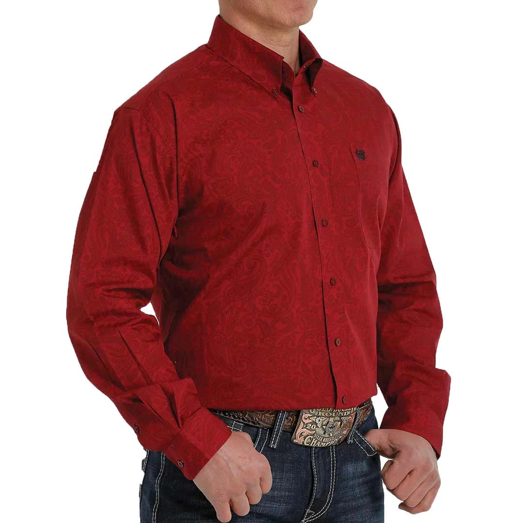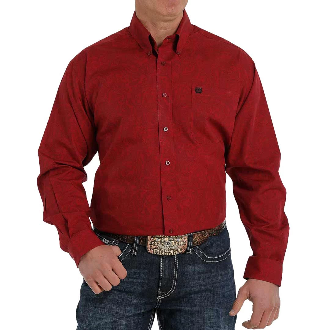 Featuring a classic paisley print in a bold burgundy colour, this Cinch brand cotton plain weave keeps you comfortable and in style at the office or the ranch. Design details include an open left front pocket with embroidered logo and burgundy buttons.