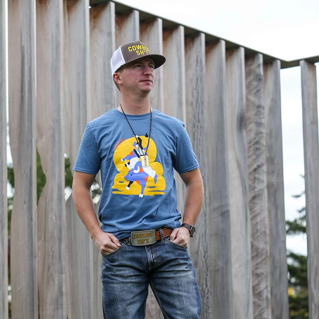 - The Blue Rider T-Shirt from Cowboy Sh*t. This is a Gildan tee made of 100% cotton in unisex sizing, featuring a bull rider graphic screenprint. Printed in Calgary, Alberta.