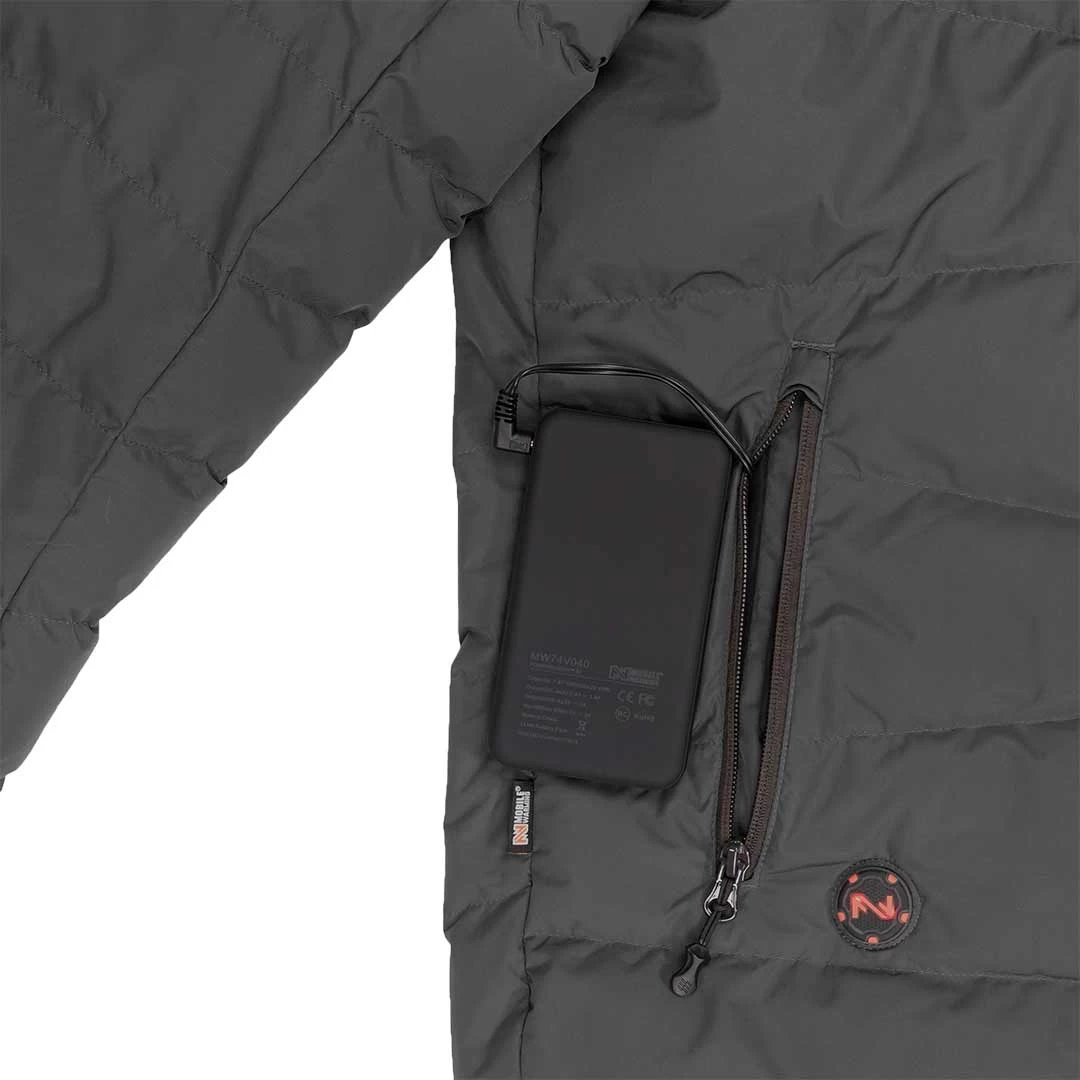Our warmest jacket yet! We start with premium RDS sourced natural duck down and add a high capacity 7.4volt Powersheer XL micro heating system to produce a jacket with superior warmth and comfort, stylish enough to wear everyday, with the added bonus of performance heat when it’s needed the most during extreme winter conditions. 5 heat zones deliver hours of warmth and are easily adjusted between 4 temperature settings from the integrated touch control button or from a cell phone using our innovative Bluetooth technology and the MW Connect App. Waterpell water resistant outer shell with keep you dry all day, and if the its late in the day and night is setting in, our Powersheer XL battery has a built-in flashlight with cell phone charging, in case your phone needs a burst of power. You’ll want to use the Crest Jacket with removable hood for both casual day trips, or longer excursions in the great outdoors.