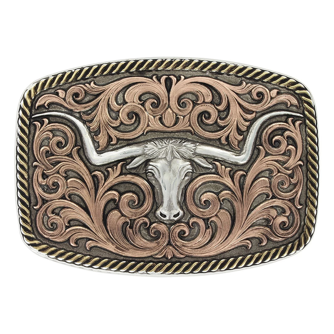 A classically themed Western buckle from Montana Silversmiths has a light antiquing covering the tri-color buckle, with silver, rose gold and yellow gold finishes. A center Champion Texas Longhorn steer silver finished figure sits surrounded by thick rose gold finished flowing filigree. This steer figure differs from our regular steer figure with a notched horn design. A thick edge of yellow gold finished rope completes the buckle design. Standard 1.5 inch belt swivel.