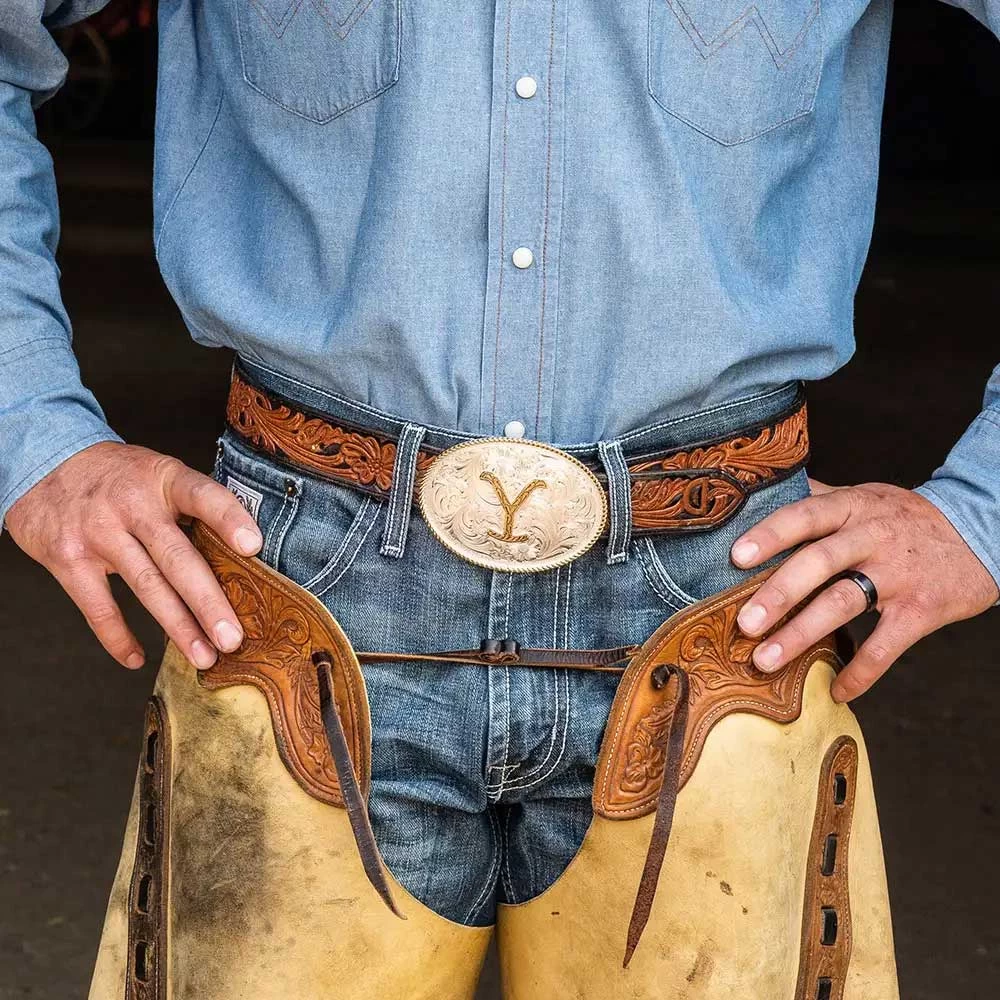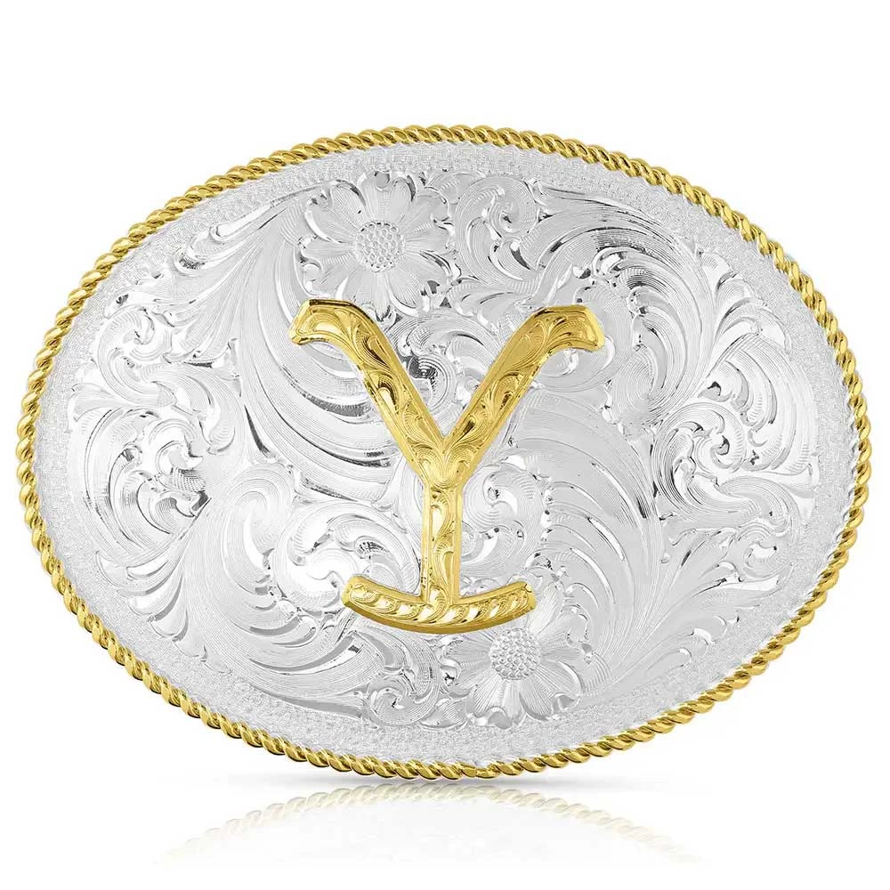 Inspired by the Yellowstone TV series this licensed buckle from Montana Silversmiths is based on the Dutton family ranch, the Yellowstone Dutton Ranch. Y figure buckle is a medium sized silver-finished oval shape belt buckle fully engraved in traditional, classic western bright cut scrolls. It is held by a twisted gold rope trim. It is engraved with a gold finished letter ‘Y’ in western style font of the Yellowstone Television show and applied to center. Standard 1.5″ belt swivel.
