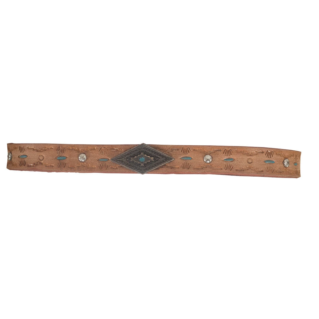 You can’t go wrong when you add this gorgeous hat band from Phunky Horse to your favorite cowboy hat. This band features a central diamond shaped concho with hand painted turquoise center, tooled inlay pattern with a turquoise hi-lighted design and silver studs. The band can be adjusted to fit any size/style of cowboy hat.
