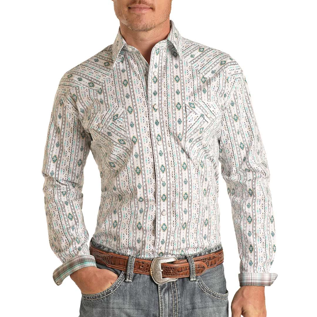 From Rough Stock by Panhandle, this men’s snap shirt is done in a white and turquoise Aztec print. It has one point yokes, 2 pockets and contrast under cuffs. A great choice for the office or a day in town.