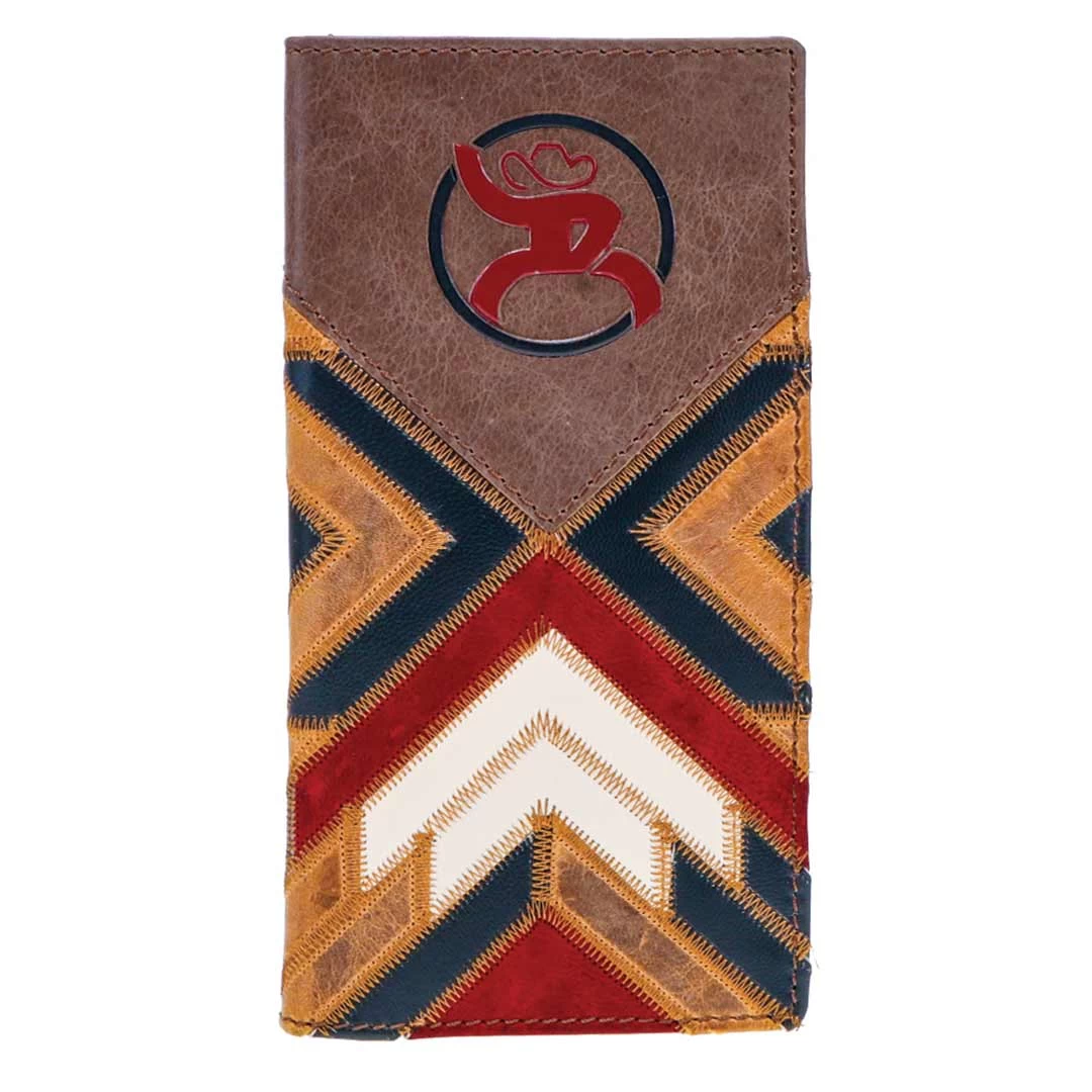 This Roughy rodeo wallet features patchwork with brown leather overlay, detailed with red & black logo and includes our custom hooey brands woven logo liner.
