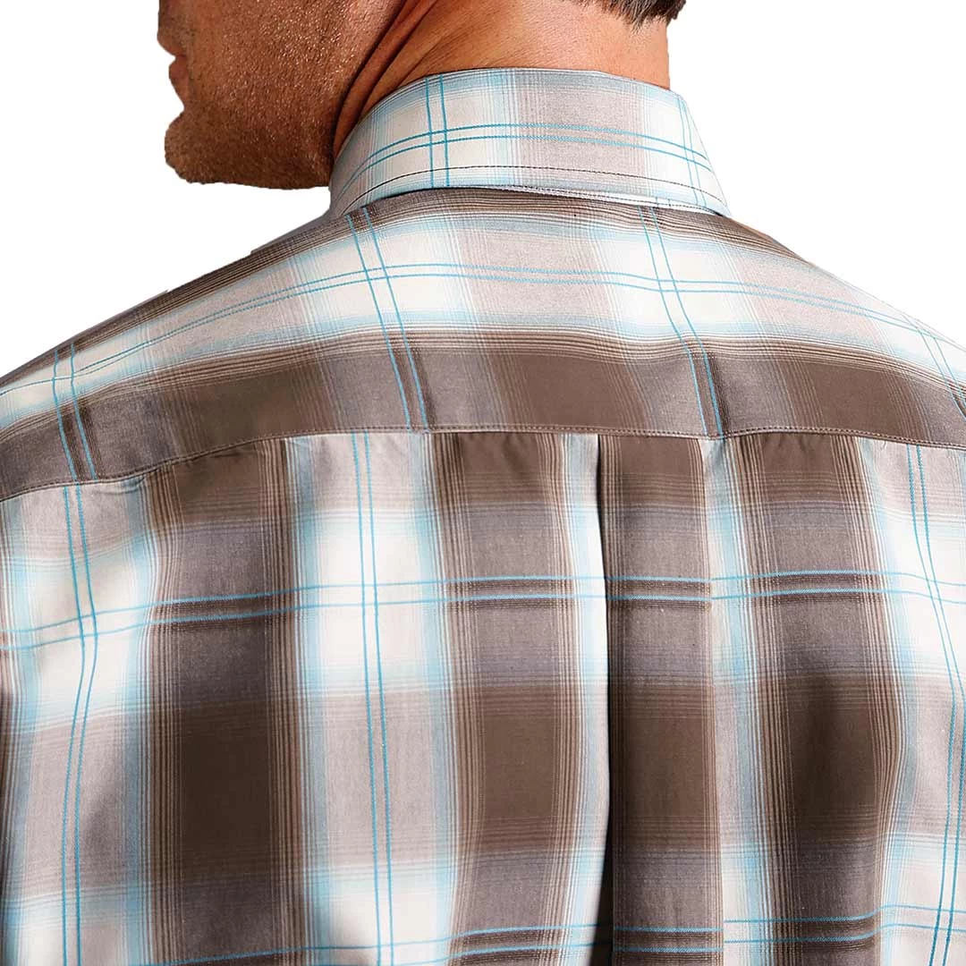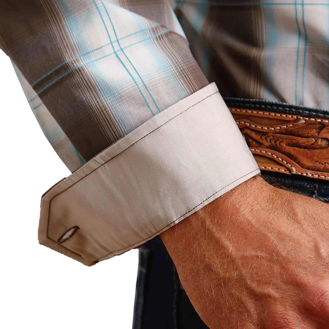 From Stetson, this long sleeve brown and light blue plaid print men’s shirt features a straight back yoke, a single open pocket and a spread collar. Perfect for a night on the town or a day in the office.
