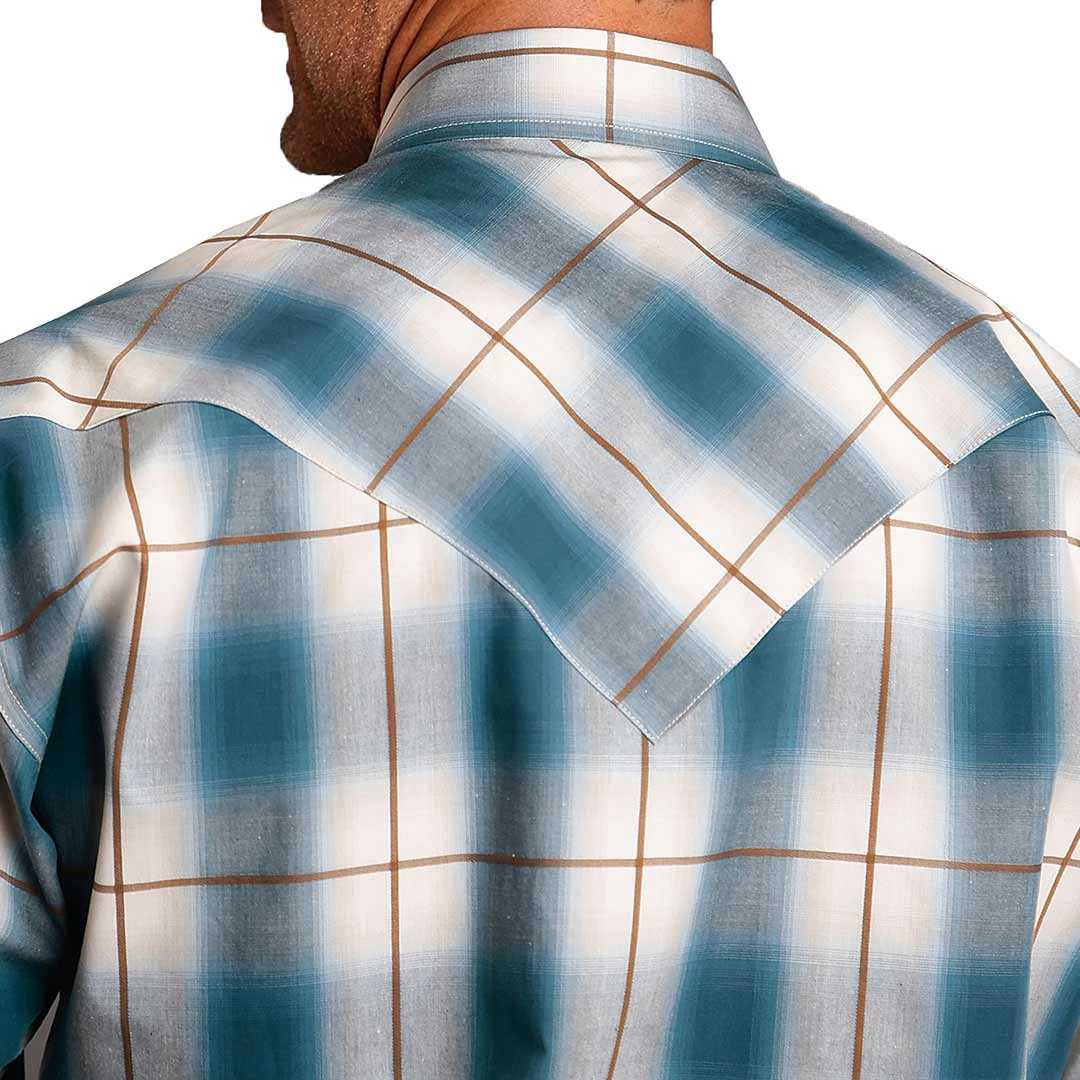 This western shirt from Stetson is done in a white and blue plaid print. It has one-point curved yokes, two snap flap pockets and contrast trim.