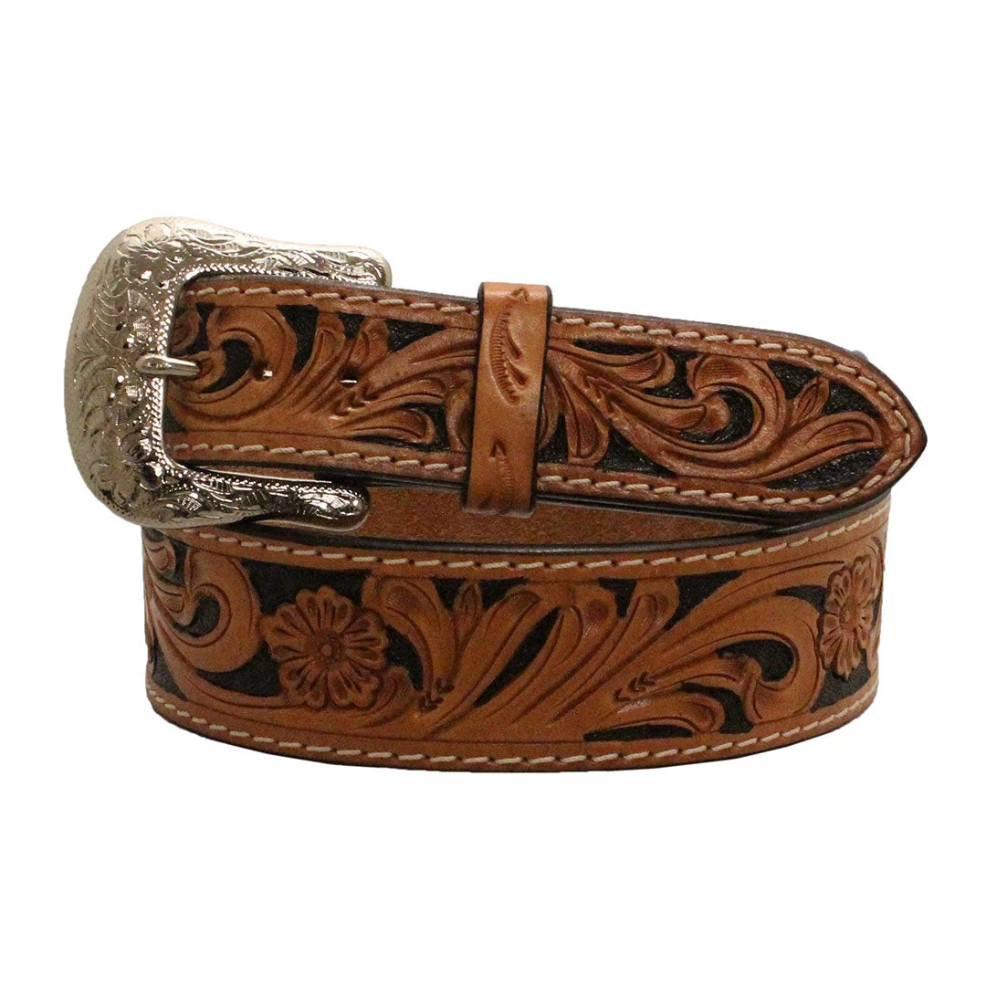 This Twisted X belt from Western Fashion Accessories features a floral tan design with black inlay, tapers from 1 3/4″ to 1 1/2″ on each end.