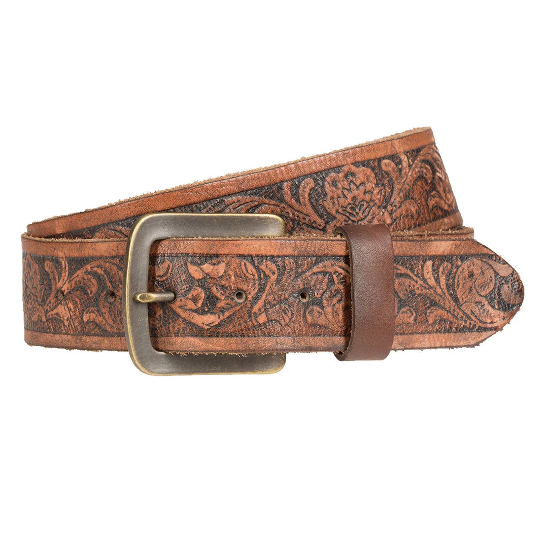 From Spirit Leather Works Wrangler collection, this tooled embossed belt features a distress look and simple but classy bronze toned buckle.