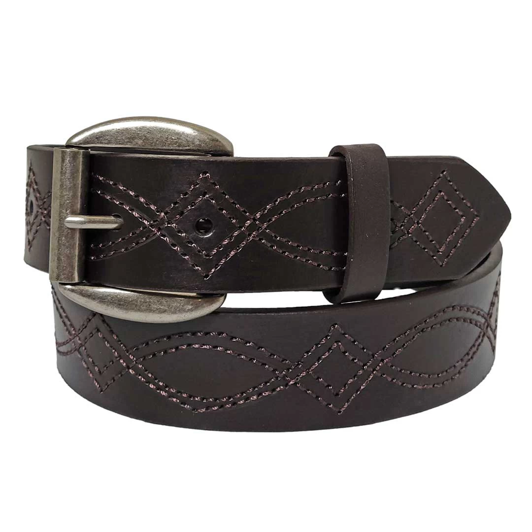 This men’s Wrangler leather belt is done in vegetable tanned leather and has a chunky roller buckle.