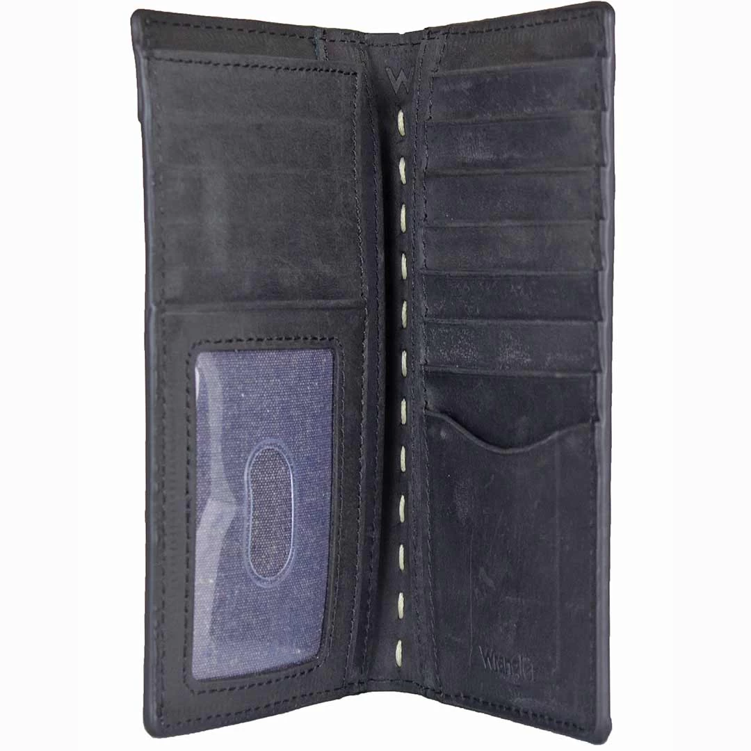 From Spirit Leather Works Wrangler collection, this rodeo style wallet features 8 credit card slots, 1 ID window, 3 slip pockets, 1 money compartment, stitch detailing and an embossed Wrangler logo.